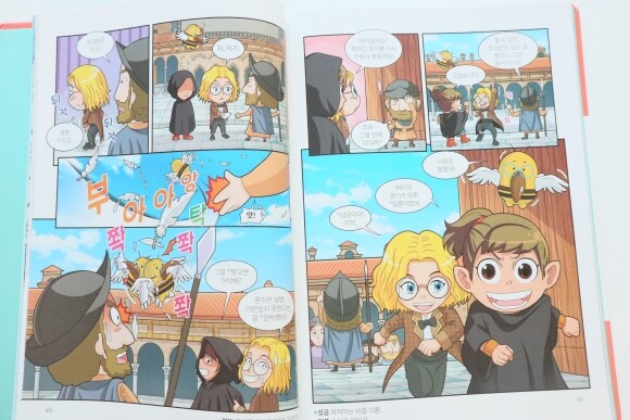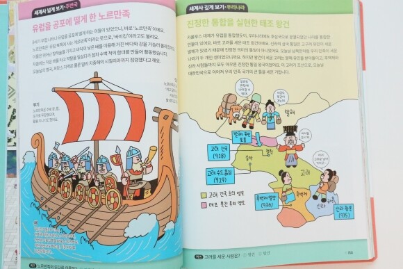 아이가 역사도 약간 편독파트가 있었거든요. 한 권으로 핵심 인물들을 시간 순으로 담아놓아서 좋았고, 중간중간 한국사도 비슷한 부분도 나와서 역사를 재밌게 바꿔 줄 만한 책이예요.