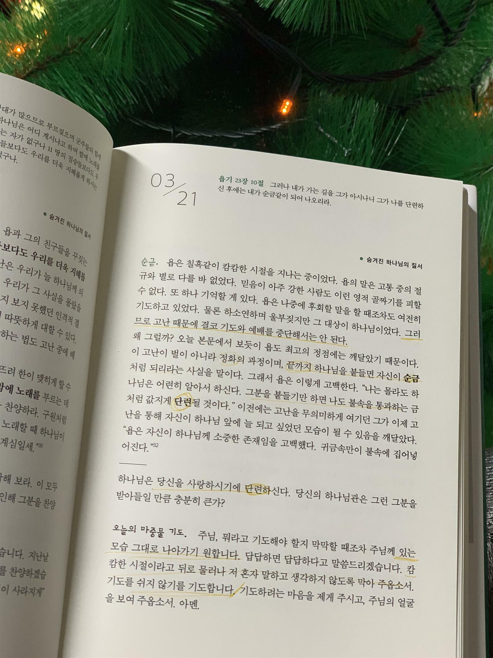 그래서 성경 구절을 시작으로  오늘의 마중물 기도라고 번역된 기도문을 읊조리다 보면 더욱 깊은 묵상으로 경건의 시간을 갖도록 도와준다잠언의 성경 말씀뿐 아니라욥기를 비롯 성경의 여러 구절을 더욱 깊이 있게 묵상하다 보면 하루하루의 삶이 풍성해지는 것을 경험하게  것이다