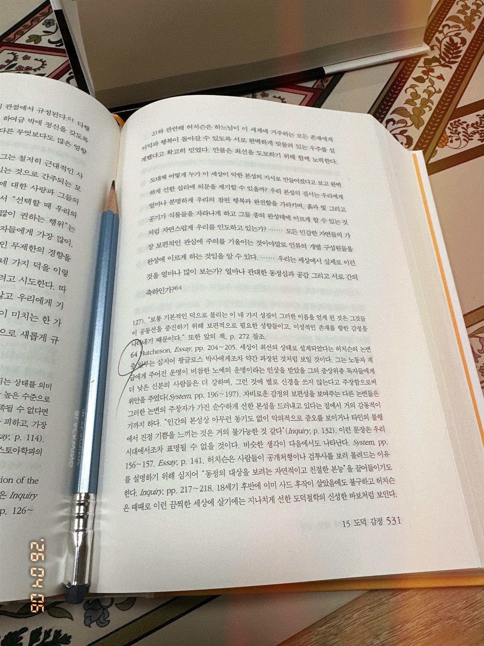 감정에 대한 18세기 이론과 더불어 우리는 또 하나의 깊은 변화를 맞이하게 된다. 여전히 계획이 중요한 문제이긴 하지만 최소한 이것에 접근하는 전형적인 길은 감정을 통해서다. 이제는 감정이 규범적인 것이 된다. 우리는 옳은 것을 최소한 부분적으로 우리의 통상적인 감정을 체험함으로써 얻게 된다. 이것에는 우리가 악습이나 잘못된 견해의 왜곡된 영향을 극복하는 것이 포함된다. - 허치슨은 외재적 이론이 어떻게 우리의 도덕 감정을 잘못 평가하게 만들며, 이로 인해 그러한 감정의 기가 꺾이게 되는지를 부단히 지적한다. 허치슨 말대로 우리는 이런 왜곡을 시정하기 위해 이성을 사용해야 할지도 모른다. 그러나 그렇다고 해서 이런 선과 악의 영역에 접근하기 위해서는 오직 우리의 도덕 감정에 의존해야 한다는 사실이 바뀌지는 않는다. 이는 내가 색맹을 교정하기 위해 질병으로 인해 손상된 신체 상태를 이성적으로 고려한다고 해서 내가 오직 시각을 통해 색깔을 파악할 수 있다는 사실이 변화되지 않는 것과 마찬가지이다.