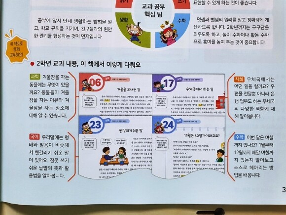 용선생 15분 독해 앞 부분에는 2학년 교과 내용이 간략하게 실려 있어요. 100퍼센트 초등 교과 연계 학습이 가능한 용선생 15분 독해이기 때문에 예습으로 풀기에도 괜찮고, 현행으로 진도에 맞추어 풀어도 괜찮은 것 같아요.