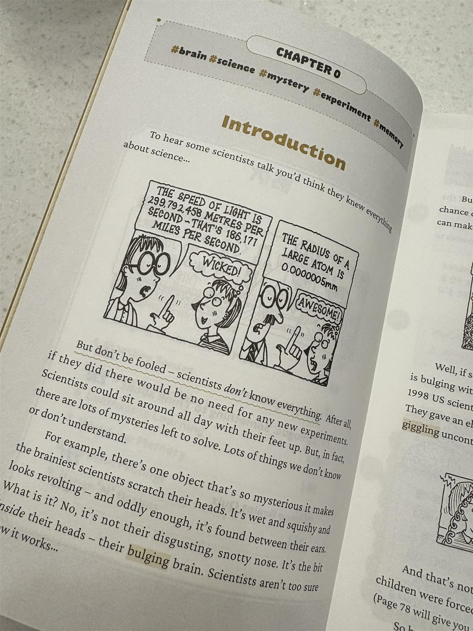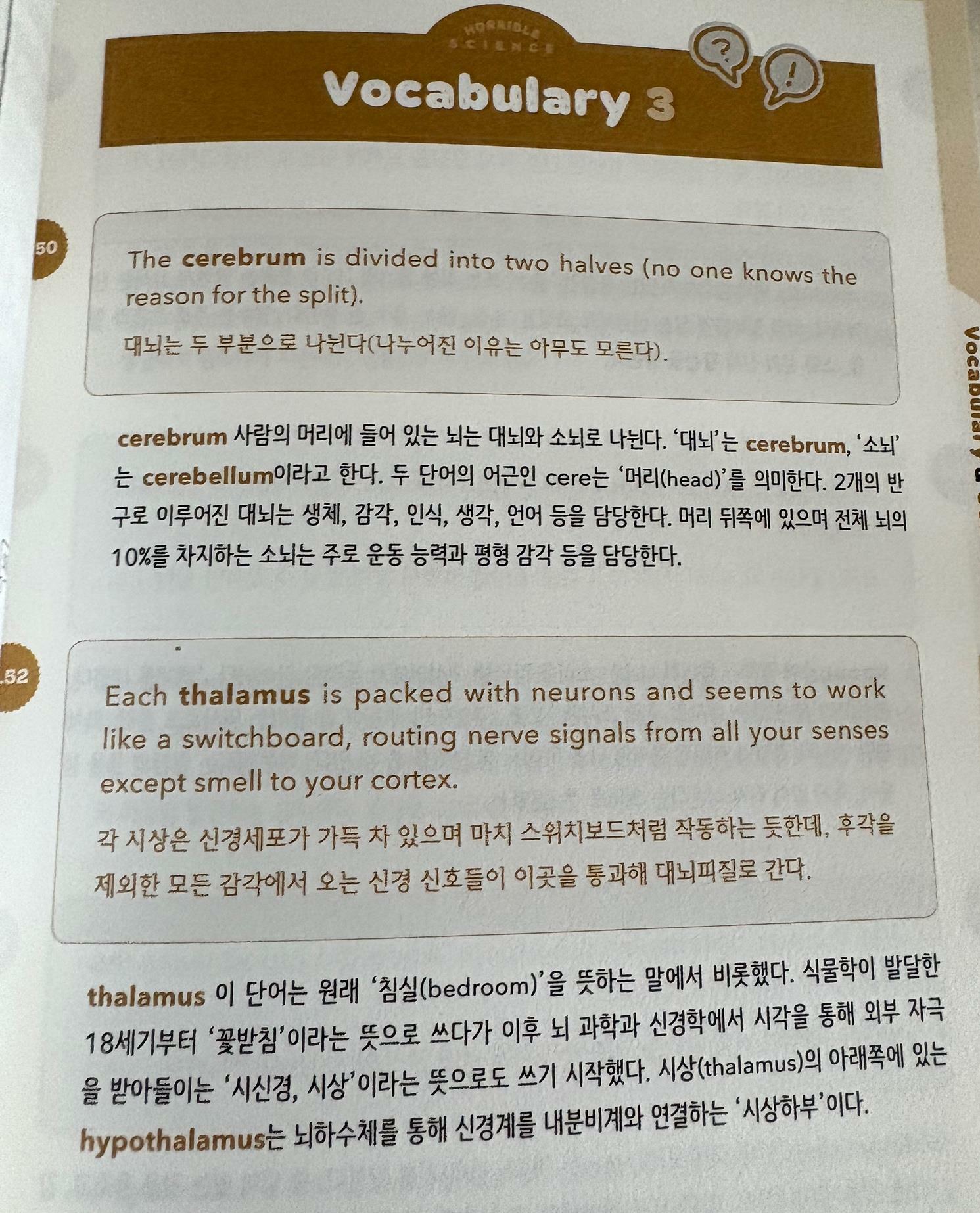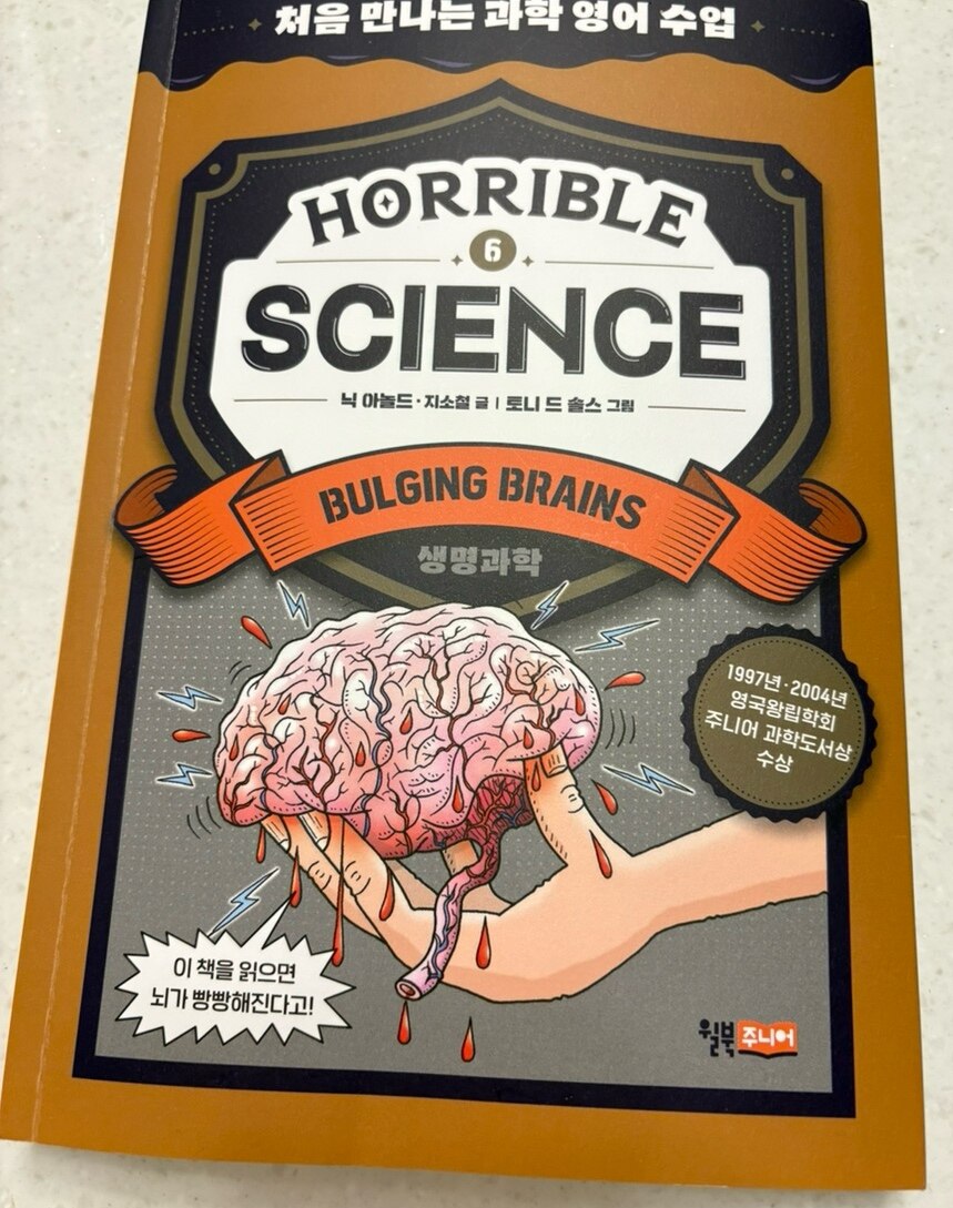 출판사로부터 도서를 제공받아 작성하였습니다 영어를 좋아하는데도 영어로 무언가를 배운다는건 어렵다고 생각한다 얼마나 영어가 어렵게 느껴졌던지 대학때 복수전공하던 심리학 전공수업이 영어강의임을 알았을때 OT를 듣고 바로 다른 수업으로 바꿨던 기억이 있다 나이를 먹고 시간이 지나 영어로 뭔가를 배워보는데 도전해보고자 이 책을 골랐다 일반적인 과학 도서와는 다른 것 같아 기대가 되었다 원서는 워낙 잘 알려져있는데다 앗!시리즈로 한국어 번역이 되어있다 원서 내용을 담은 Horrible Science는 5권이 먼저 출판되었고 (물리,화학,지구과학,생명과학) 추가로 5권이 출판되어 (뇌,신체,시간,진화,생태) 총 10권 시리즈로 구성되어있다 나는 그 중에서 뇌와 관련된 책을 골랐다 ‘불룩한 뇌Bulging Brains’라는 표현 자체가 다소 엽기적인? 리얼한 표현이라 Horrible Science라는 책 제목과도 일맥상통한다고 느꼈다 특유의 익살스러운 삽화가 내용 곳곳에 삽입되어있고 자칫 딱딱하게 느껴질 수 있는 내용을 유머러스하게 풀어주기도 한다 챕터별로 키워드가 제시되고 삽화와 함께 영어로 글을 읽을 수 있는 구조이다 밑줄과 하이라이트 되어있는 부분은 뒷장에서 상세하게 해설을 확인할 수 있다 앞서 영어 본문에서 밑줄과 하이라이트가 쳐진 부분에 대한 상세한 설명이 수록되어있다 설명해주는 어휘수준은 초등 고학년 정도인 것 같다 마지막장에는 읽은 내용에 대한 퀴즈가 수록되어있어 기억이 나지 않으면 여러번 읽거나 해당 내용을 다시 읽어보는 기회를 제공한다 개인적으로 뇌에 대한 내용이라 어려울 것 같아 읽기 전에 걱정을 했었다 하지만 읽어보니 어휘 수준이 어렵지 않은데다 익숙하지 않은 어휘는 몇번 검색해보면 부담없이 읽을 수 있었다 특히 뇌에 대한 용어들이 좀 어렵게 느껴졌지만 vocabulary에서도 다루어주고 검색하면서 이런 내용이구나 알아가는 재미도 있었다 그리고 앗!시리즈를 읽은 사람이라면 익숙한 삽화는 특유의 익살스러움으로 내용을 더 잘 기억하게해준다 손바닥만한 뇌의 기능이 어마무시해서 아직도 다 알려지지 않았다는 점, 우리가 느끼고 생각하는 모든 과정은 뇌를 거친다는게 새삼 신기했다 그리고 이런 개념을 나타내는 영어단어도 알 수 있어 유익했다