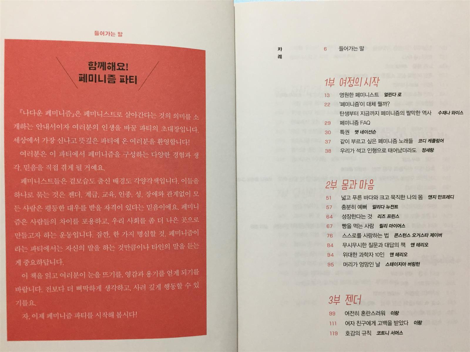 대한민국에서 남성으로 살면서 여성들보다 많은 혜택을 받으면서 살아왔구나 생각을 하고 있습니다. 그리고 내 딸을 위해서라도 여성이라고 해서 차별받지 않는 세상을 꿈꿉니다. 남녀 평등이 이루어지는 세상을 꿈꿉니다. 아내와 집안 일을 같이 한다고, 육아을 같이 한다고 한순간에 이뤄지는 것이 아닌 것을 압니다. 아직도 같이 하는 것이 아니라 ‘일을 돕는다’라는 생각이 조금 이라도 자리 잡고 있기 때문입니다. 이때 마흔 네명이 ‘자신이 생각하는 페미니즘’을, 페미니즘으로의 초대장을 보내왔습니다.
