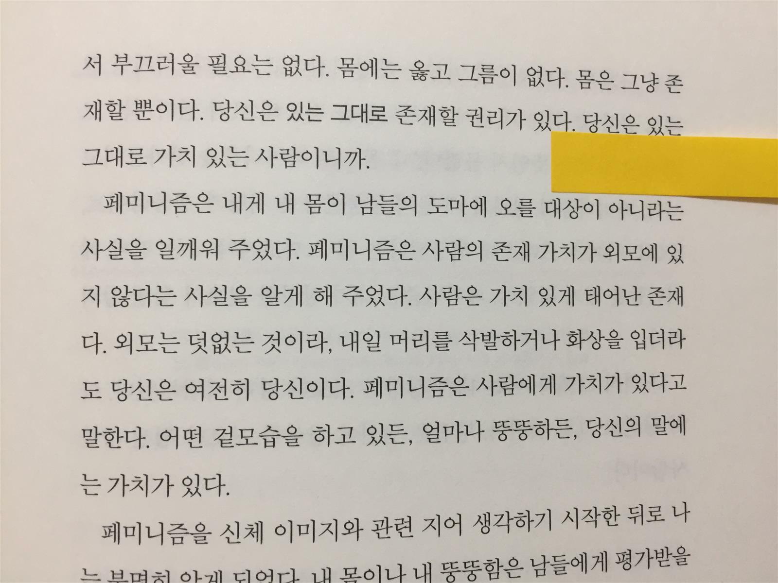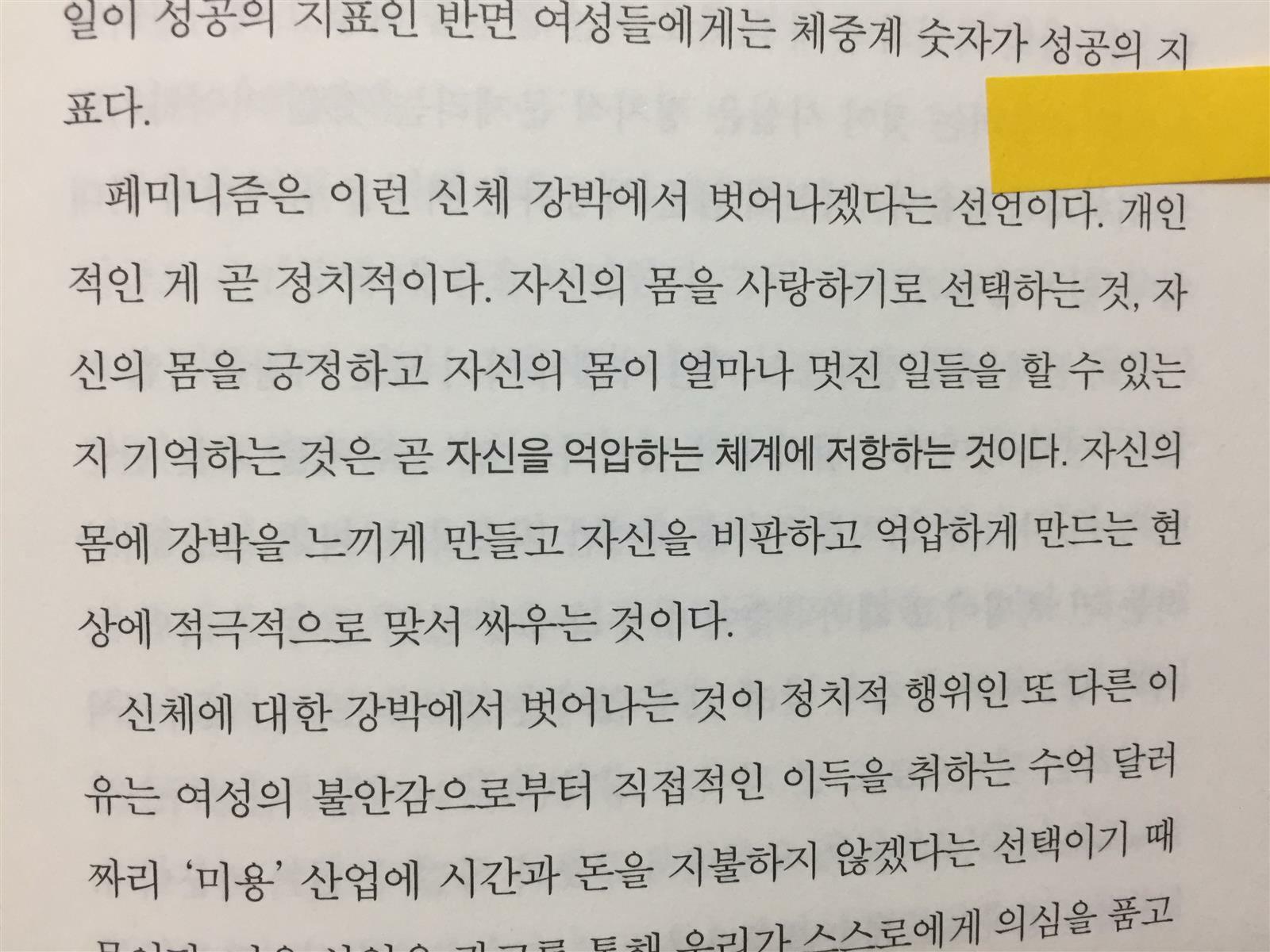 페미니즘은 신체 강박에서 벗어나겠다는 선언이다. 개인적인 것이 곧 정치적이다. 자신의 몸을 사랑하기로 선택하는 것, 자신의 몸을 긍정하고 자신의 몸이 얼마나 멋진 일들을 할 수 있는지 기억하는 것은 곧 자신을 억압하는 체계에 저항하는 것이다.