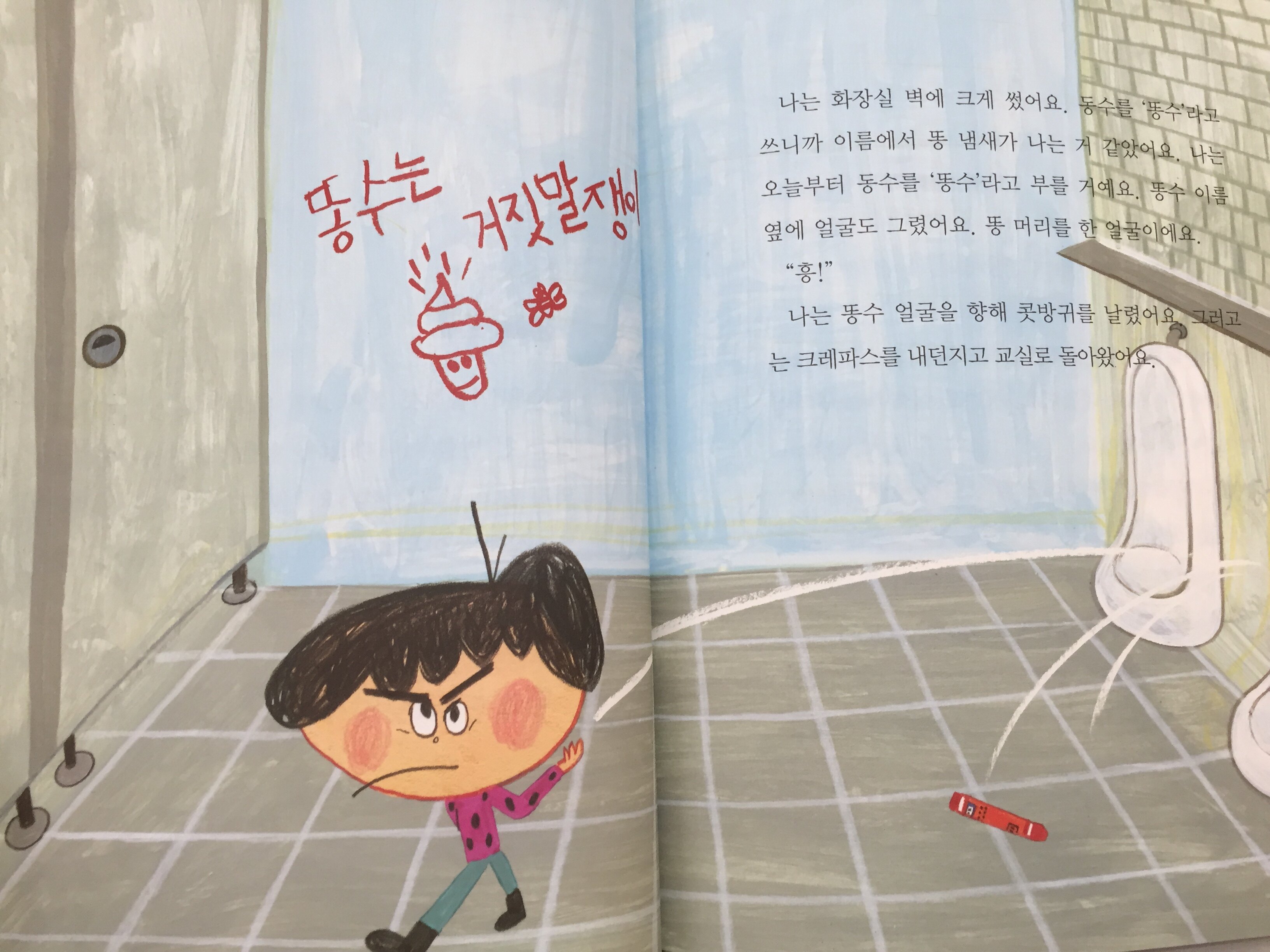 같이 사고를 친 동수가 거짓말을 한다고 느껴 현준이는 화장실에 이런 낙서를 해놓습니다.