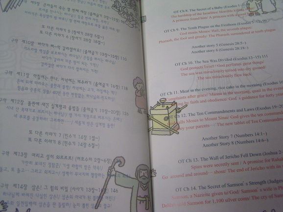 먼저 차례를 보면, 구약과 신약으로 나뉘어져 구약 24장, 신약 24장으로 구성되어 있는데, 차례를 영어로도 소개하고 있어 영어공부하시려는 분들께 도움이 될 것 같다.