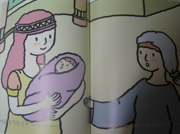 위 그림은 제8장 <몰래키운 남자아기 편 ’출애굽기 2장 8절’> 가운데 마음씨 착한 애굽공주의 손에 의해 건져진 갈대상자 속의 아기모세가 젖먹일 유모를 구하던 애굽공주의 부탁으로 자기 어머니 요게벳에 의해 키우게 되어지는 그림으로 모세공주가 참 착하고 온순하게 그려져있고, 아기도 너무 귀여워서 그런지 아이들이 무척 좋아하는 그림이다.