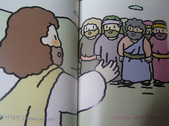 위 그림은 P333쪽의 예수님과 제자들에 대한 이야기가운데 하나이다. 예수님이 제자들을 불러놓고 <얘들아! 사람들이 나를 누구라고 하느냐?>하고 물어보셨다. (마태복음 16장 13절)