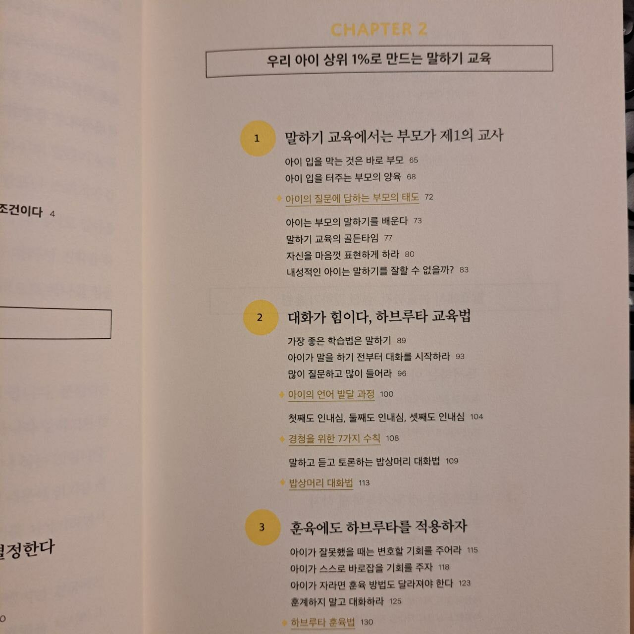 <2. 우리 아이 상위1%로 만드는 말하기 교육>에서는 말하기 교육에 있어서 부모의 태도와 아이의 양육 방법에 대한 조언을 통해 자신을 표현하는 아이로 성장하게 하는 방법을 이야기한다. 특히 하브루타 교육법을 통해 대화의 중요성, 질문과 경청의 중요성, 밥상머리 대화법에 대한 이야기를 통해 말하기와 대화 (소통)가 중요함을 강조한다. 개인적으로는 '집밖에서' 업그레이드 하라는 내용이 인상적이였는데, 가족행사에서 스피치를 활용하는 기회로 만드는것, 줄서서 기다리는 시간을 대화로 이끄는 것, 차안에서의 대화와 언어놀이 부분을 앞으로 더 잘 활용하기로 마음 먹었다.