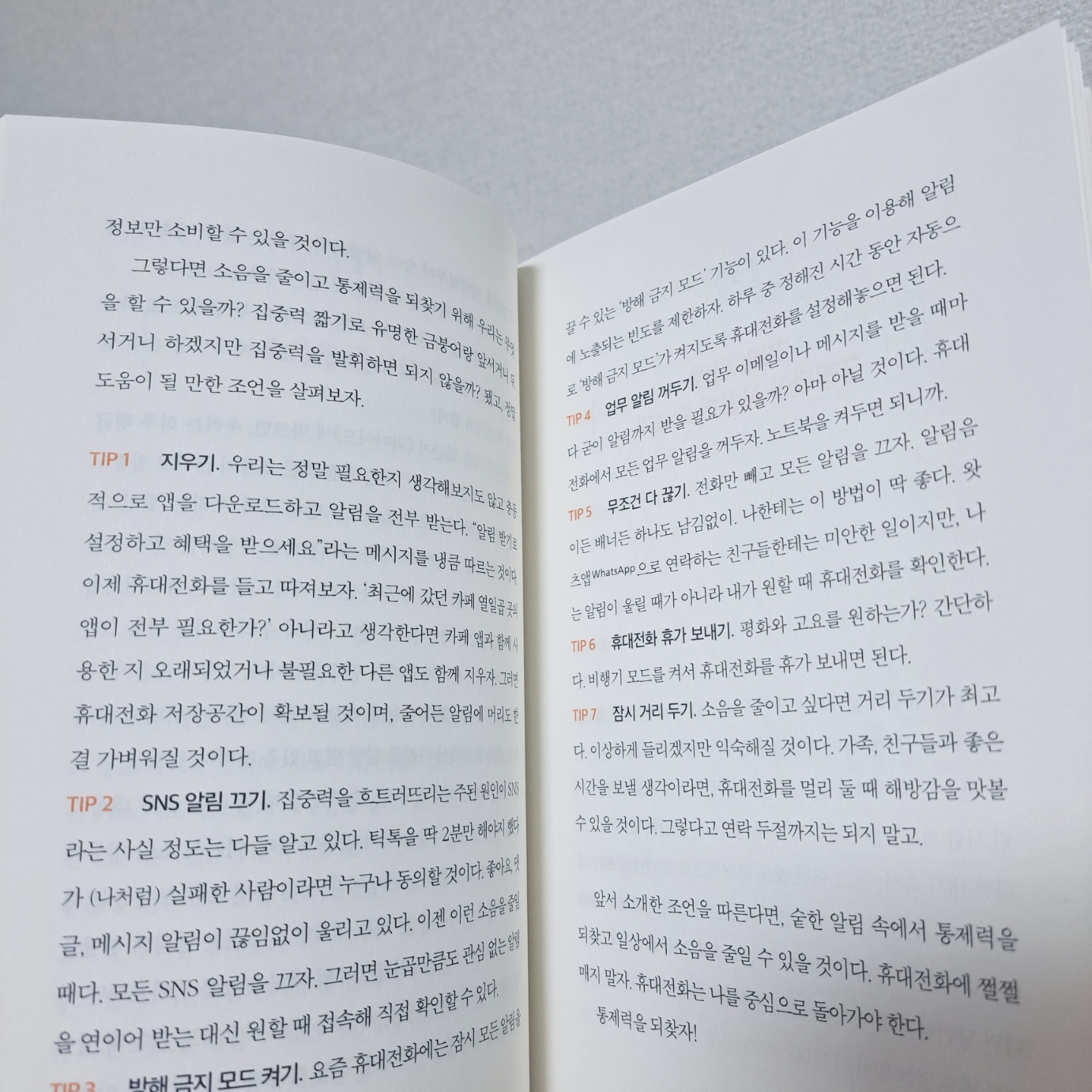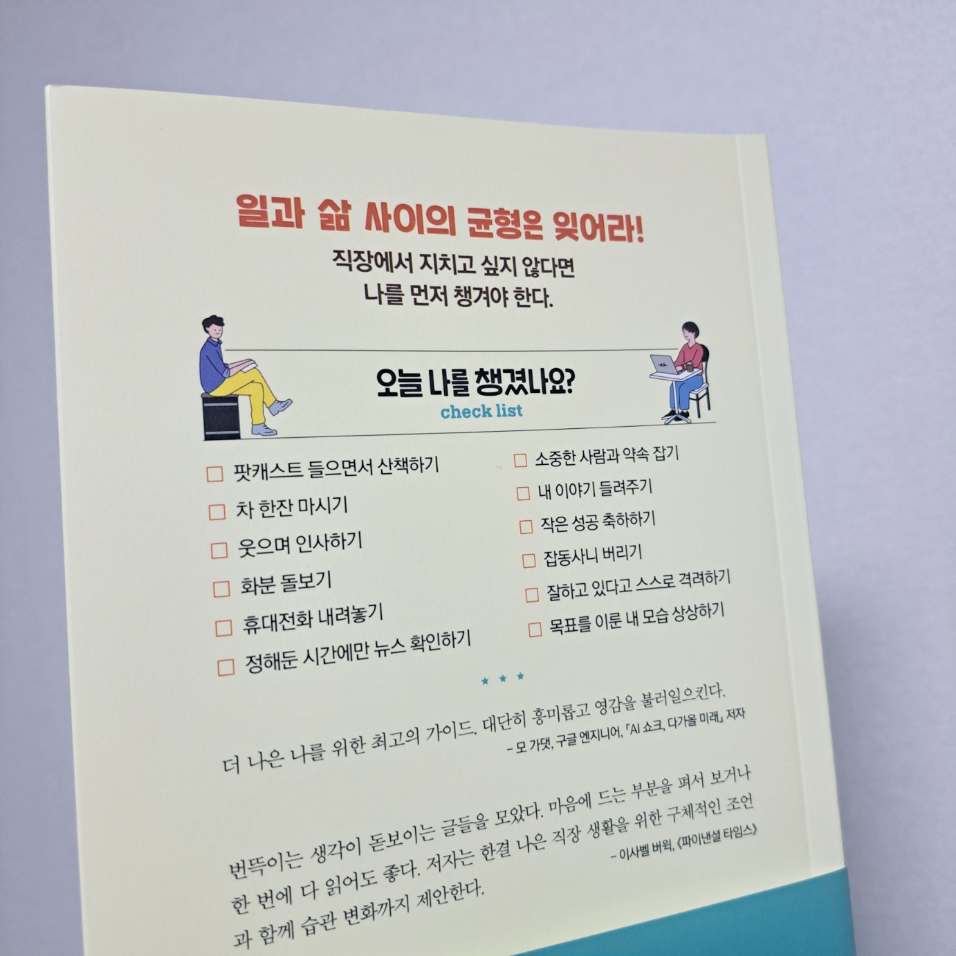 책은 직장과 개인의 삶의 균형과 공존, 건강한 삶을 위한 방법들을 공유를 목적으로 씌어졌지만, 결국 삶을 건강하고 행복하게 하기 위한 실천들을 이야기하기에 - 더 나은 자신, 더 좋은 삶을 위해 노력하는 누구나 읽고 도움을 받을 수 있는 책이다. 각 장의 내용과 제시하는 팁 중 하나라도 실행하게 되면 결국은 팁 하나가 여러 가지 제안과 연결되기도 하기에 가볍게(?) 실천해 보려고 한다.  최우선  나의 챙김 리스트는? 휴대 전화 내려놓기다.