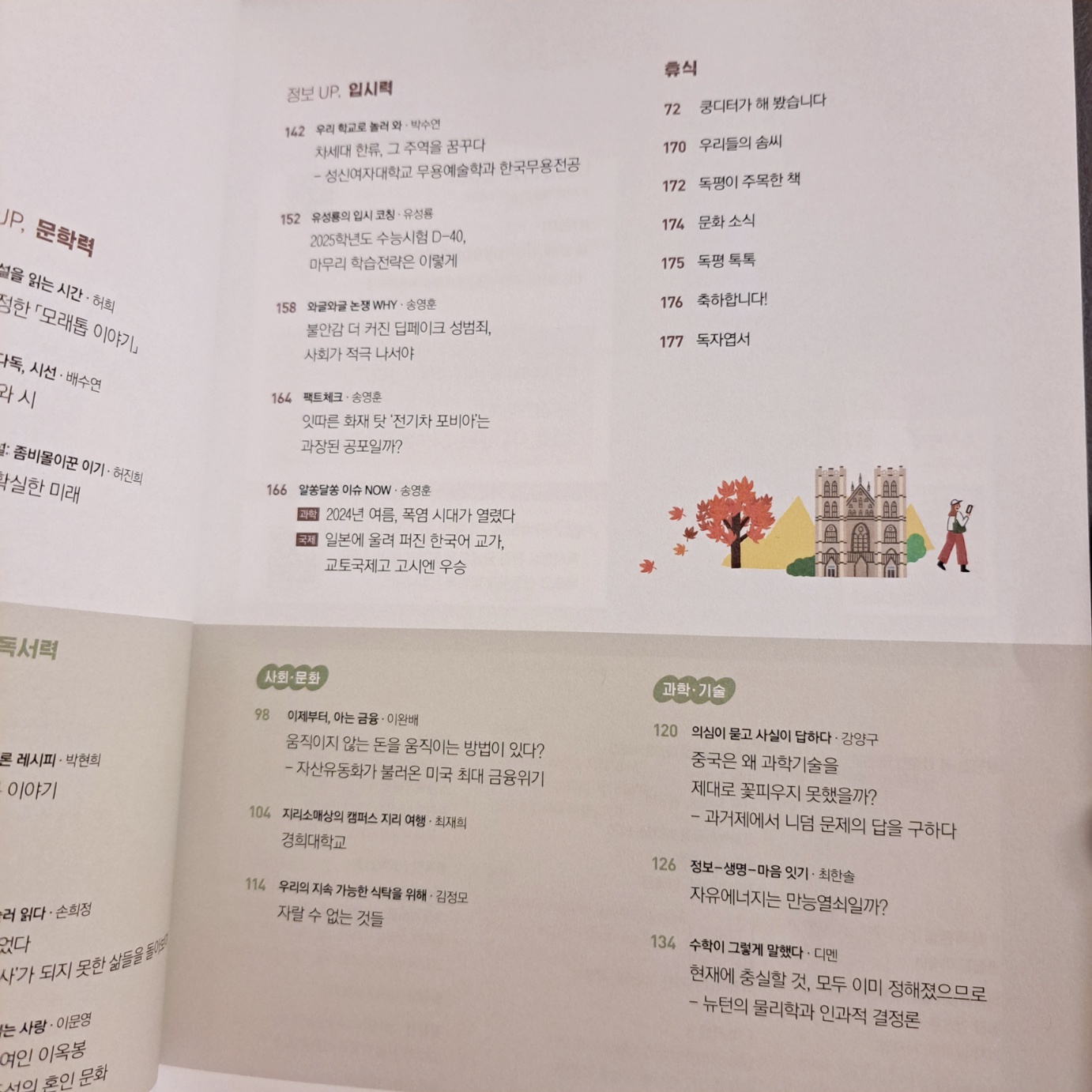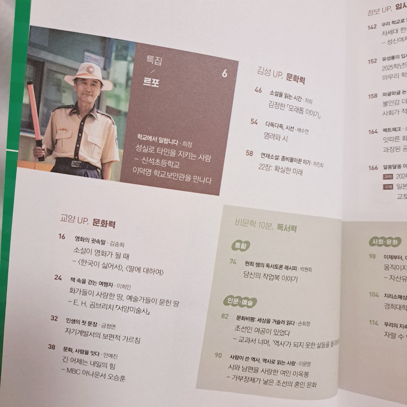 목차를  보니 문화와 교양, 인문 사회와 예술,  문학과 독서, 과학과 기술 등 다양한 분야를 두루 살펴볼 수 있고, 비문학 독서력을 향상을 위한 <비문학 10분, 독서력> 코너도 흥미로운 분야와 주제를  10분에 읽을 만한 분량으로 제시하고 있어 고등 친구들이 부담 없이 다양한 분야를 접할 수 있는 구성이라 좋을 것 같다.
