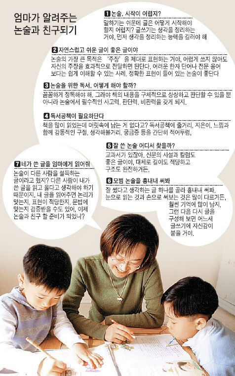 가정에선 아이가 주장을 펼칠 때 자신의 생각이나 입장, 견해나 이유, 근거와 설명 등을 담도록 유도해야 한다. 가족끼리 토론한 내용을 정리해 글로 쓰도록 하는 것도 좋다. 아이 자신의 주장과 다른 주장에 대한 각각의 근거를 만들고 쟁점이 무엇인지, 상반되는 주장이나 입장의 장단점은 어떤지 비교해 글로 정리하도록 이끄는 것도 방법이다.