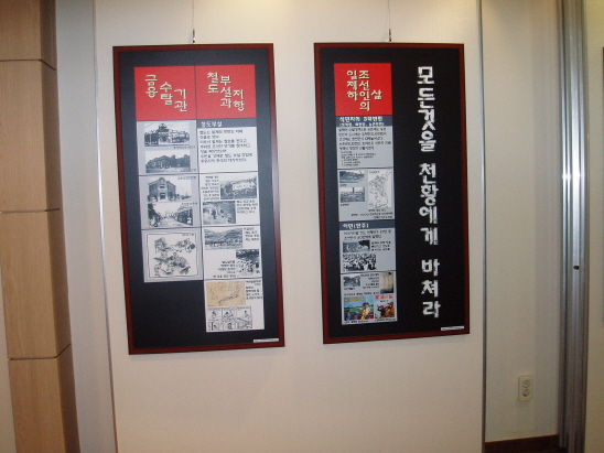 <저들을 이것을 ‘해방’이고 ‘진출’이라 부른다> <모든 것을 천황에게 바쳤다> <부활하는 군국주의> <교과서 왜곡> <부끄러운 자화상 ‘친일파’를 고발한다> <과거청산> 등의  제목으로 모두 38개의 패널로 전시 중인  이번 전시에 대한 문의는  부산 중구 문화관광시설관리사업소로  하면 된다. (담당자 박향숙 051-600-4542)