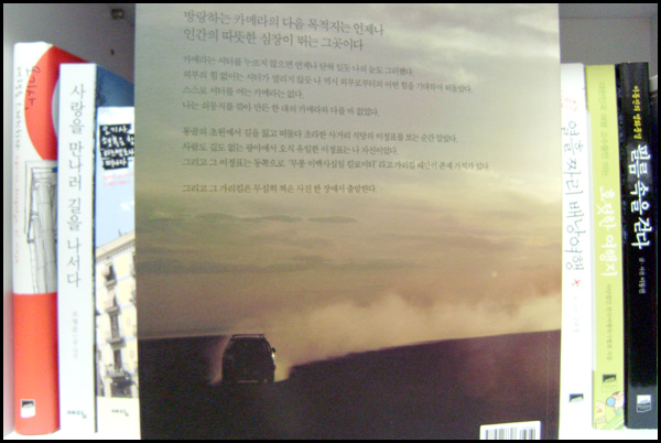 사실 책을 받아들기 전까진 이책 또한 가볍게 볼 수 있는 사진과 간략한 에피소드들이 실려있는 그저그런 여행사진책이 아닐까 생각했었다. 그러나 나의 예상은 기쁘게도 빗나갔다. 처음부터 사진과 글의 포스가 만만찮다. 카메라 렌즈로 보는 세상과 그 순간을 담는 셔터의 깜박임, 사진이 찍힌 순간과 작가의 눈에 보이는 풍경에 대한 그의 이야기는 가벼운 마음으로 책장을 들추던 나조차도 한 장의 사진속에 담겨진 작가의 수많은 고민과 함축된 의미들을 생각해보게 만들었다. 여행사진책을 많이 본 건 아니지만 <김홍희 몽골방랑>은 이제껏 본 책들 중에서 가장 철학적 향기를 풍기는 사진책이었다.