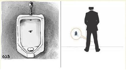 언젠가부터 변기에 생겨난 조준마크 혹은 위와 같은 파리스티커들. 모두 정확한 조준(?)을 유도하기 위한 일종의 장치인 셈이다. 실제로도 이 스티커가 처음도입된 공항에서는 변기밖으로 튀는 소변의 양이 80% 감소했다는 보고가 있다.