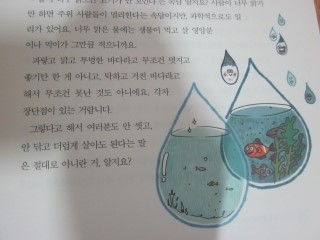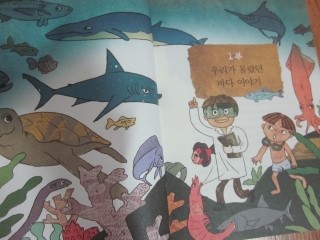 바다생물에서 항생제등의 약도 만들어내고, 바다속의 다양한 광물들, 바다 생물들의 이야기, 바다를 보존하고 지켜야하는 방법등 아이가