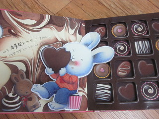 고양이 두마리가 사이좋게 마주보고 있어요. '나랑 네가 고양이 인데, 나한테 생쥐 두마리가 있다면 너한테 한마리를 줄 거야.' 초콜렛 상자에 초콜릿이 가득하네요. 토끼는 초콜릿을 한입 베어 물고는 기분좋은 웃음을 짓고 있답니다.' 나는 초콜릿보다 널 더 좋아해!(정말 정말 진짜 진짜야!)' 달콤한 초콜릿보다 더 달콤한 말이지요.