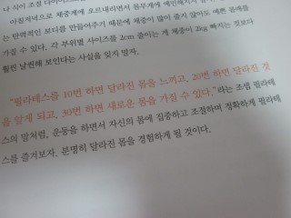 큰 사진과 함께 설명이 나오니 따라해보고 싶다. 당장 소기구 없어서 소기구가 없어도 되는 고관절 스트레칭부터 시도 해본다. 안쓰던 근육을 썼더니 허벅지 안쪽이 막당기며 저린다. 운동이 절실하구나 싶은 순간이다. 사진을 보면 그렇게 많은 동작이 나온다는 생각이 안든다. 몇단계만으로 효과적인 운동법이라니 시도해 볼 만하다. 내몸의 장점을 위주로 그 부분을 운동해야겠다. 앞표지의QR코드를 찍으니 동영상이 나오는데, 설명과 함께 운동하는 자세가 나온다. 이제 밤에 스마트폰으로 다른거 보지말고 필라테스 동영상보고 따라해야겠다.