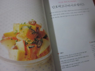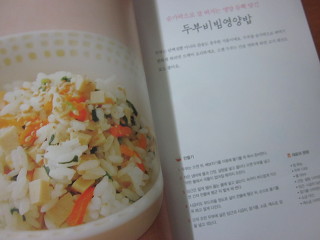 책에는 반찬으로 녹두당면을 5센티로 자른다. 오이, 파프리카, 햄, 숙주는 2센티길이로썬다. 끓는물에 당면과 야채재료를 넣고 익힌다. 샐러드소스(참기름,식초,설탕,간장,소금약간)를 넣고 골고루 섞는다.
