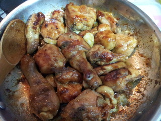 닭날개는 닭한마리로 대체했어요. 우유에 담갔다가 깨끗이 씻어 헹궈낸 뒤 생강가루, 소금, 후추로 밑간하고, 팬에서 노릇하게 구어요. 그리고, 조림장(간장2.5큰술,레드와인1/2콥,물엿2큰술,흑설탕2큰술,맛술1큰술)을 넣고 졸이면 된답니다. 흑설탕이 없어서 설탕으로 대체했는데, 흑설탕이면 색이 더 진하겠지요. 맛은 두 말 할 필요도 없어요. 한번 해보니 미흡했던 부분과 다음엔 더 잘할 수 있겠다는 자신이 생기네요.