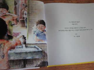 '맑은 하늘, 이제 그만' 이란책인데요. 여덟살 맑음이는 혼자서 양치질을 잘해서 늘 칭찬을 받는데요. 하지만 수돗물을 콸콸 틀어놓고 하네요. 깔끔이란 별명을 가진 엄마는 거품을 가득내어 설거지를 하세요. 콸콸 수돗물을 틀어놓고 전화통화도 하시네요. 아빠의 보물1호인 자동차. 비가올것같은 날씨에도 수돗물을 뿌려고 열심히 차를 닦으시네요.