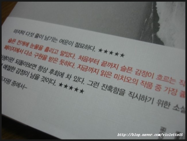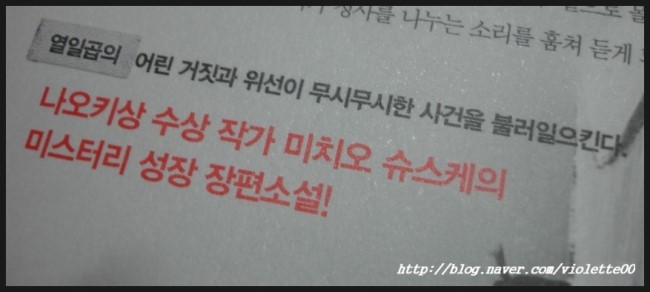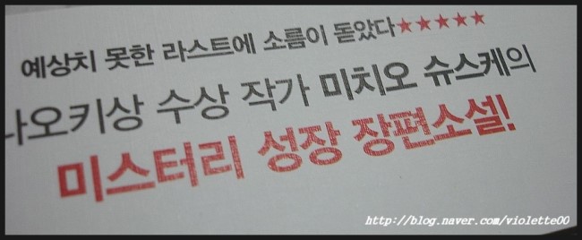 - 더 이상 미치오 슈스케에겐 어쩌면 그의 고유의 색인 미스터리를 기대치 말라, 고는 하고 싶지 않습니다. 이 소설은 그 전작들처럼, 아프다. 쿡쿡, 명치의 언저리가 아파왔습니다. 그 진실이 .. 그러나, 매번 책을 말함에 있어서 "큰 기대치" 는 갖지 말라고 말하고 싶습니다. 다만,저는, 이 책의 기대치를 내려놓고 봐선지, 괜찮았습니다. 다만, 가독성은 "용의 손은 붉게 물들고" 를 생각한다면, 조금 느린 템포로 나갔고 나오키상 이후, 조금 미스터리를 써주길 기대하고 있습니다. 여러분은 어린왕자의 질문에 무어라고 답하셨나요..? 알면서 혹시, 침묵하진 않으셨는지요? 왜냐면, 우린 이미 그 답을 알고 있었으니까요...다만, 알고 싶지 않았을 뿐이랍니다. 그 묘한 침묵을 그려냈다, 라는 건 이 표지와 제 이웃님의 블로그를 들렀다가 알 수 있었답니다.