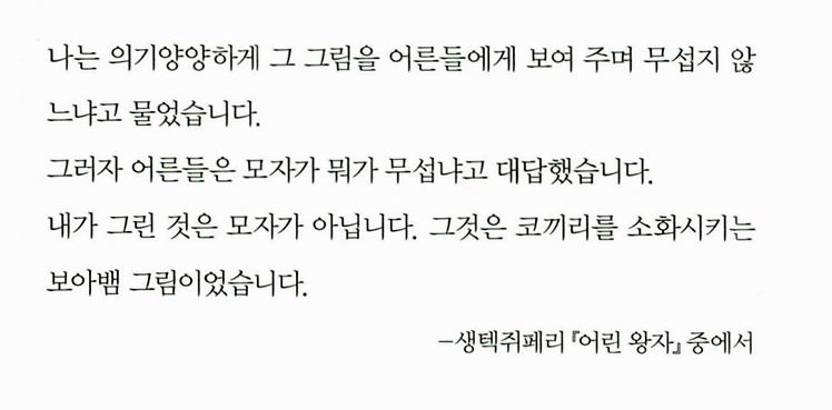 이야기는, 어쩌면 이 표지의 것이 다 말하고 있는지도 모르겠다. 어른이 되고 난 뒤, 우리는 어쩌면 더 많은 것을 볼 수 없을 지도 모른다. 그리고 더 많은 것을 보면서도 그저 침묵하고 있게 될 지도 모른다. 보아뱀의 이야기는 그렇다. 그냥, 보면 그것은 우리에게 무섭지도 않지만, 어린 아이들이 보면, 그 모자는 코끼리를 잡아먹는 보아뱀으로 보이면서 소름끼치는 공포가 된다. 그리고 그것은 내내 남아버린다.