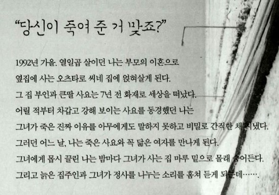 오늘, 그 겨울의 끝에서 한 남자를 만났습니다. 그리고 그의 곁에는 평범한듯, 단정한 아내라는 이가 웃으면서 있었는데 그의 눈은, 공허하게도 다른 곳을 향하고 있었습니다. 그 남자에게서 아까의 그 소년이 보입니다. 웅크리고 내내 울던 그 소년이 말입니다. 그런데 이상도 하지요. 똑같은 소년인데.. 참으로 미묘하게 다릅니다. 아무것도 모르던 소년, 그러나 죄책감의 소년, 그러다가 한편으로는.. 참 무서운 소년, 그리고 한쪽 눈을 감은 소년이 보입니다. 같은 듯, 아주 다른 그 소년은 ... 이미 한 사람의 성인이네요..
