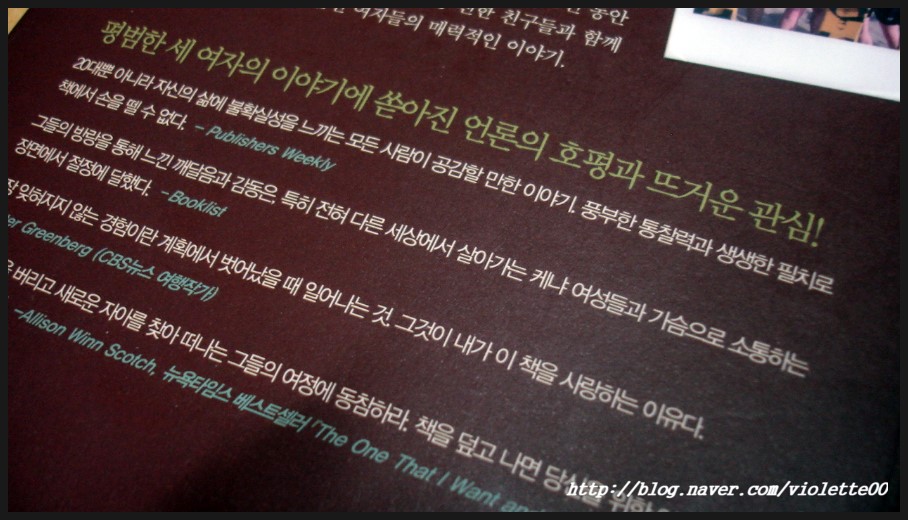 이 책은 서른을 앞둔 스물여덟,의 동갑내기 친구인 제니퍼(젠), 할리(할), 그리고 아만다가 여행을 하면서 쓴 글이다. 게다가 600페이지씩이나 되는 이 긴 여정을 썼는데, 참으로 실망스러웠다. 책을 펴기전까진 어느정도 기대를 했었다. 서른, 그 나이를 앞두고 불안한 마음, 그리고 용기있게 떠난 그녀들이 얻어올 것은 무엇인지를 말이다. 그러나, 초반부터 어긋나기 시작한다.