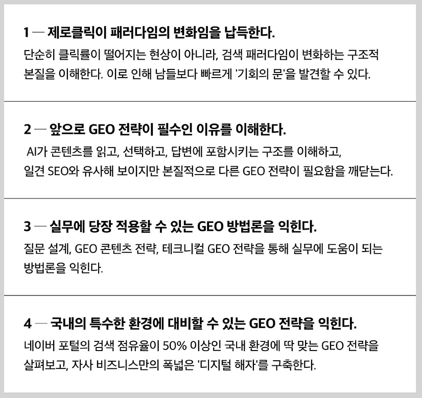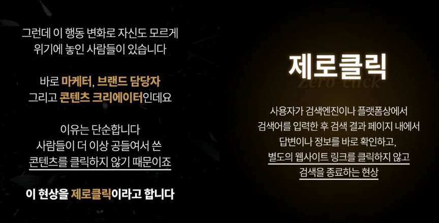 '제로클릭' 은 기술적인 트렌드를 나열한 책이 아닙니다. AI라는 거대한 변화의 흐름 앞에서 당황하고 있는 마케터, 기획자, 그리고 브랜드 운영자들에게 "이제는 클릭이라는 행위를 유도 하기 보다는 사용자가 의도한 답변을 제시해줄 AI가 인용할 수 밖에 없는 최적화된 콘텐츠를 제공 해야한다" 라고 조언하는 실질적인 전략서에 가깝습니다.