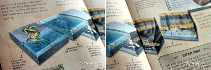 화석이 만들어지는 과정이 그림으로 잘 표현되어 있습니다.