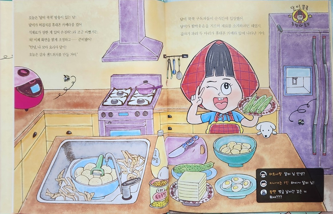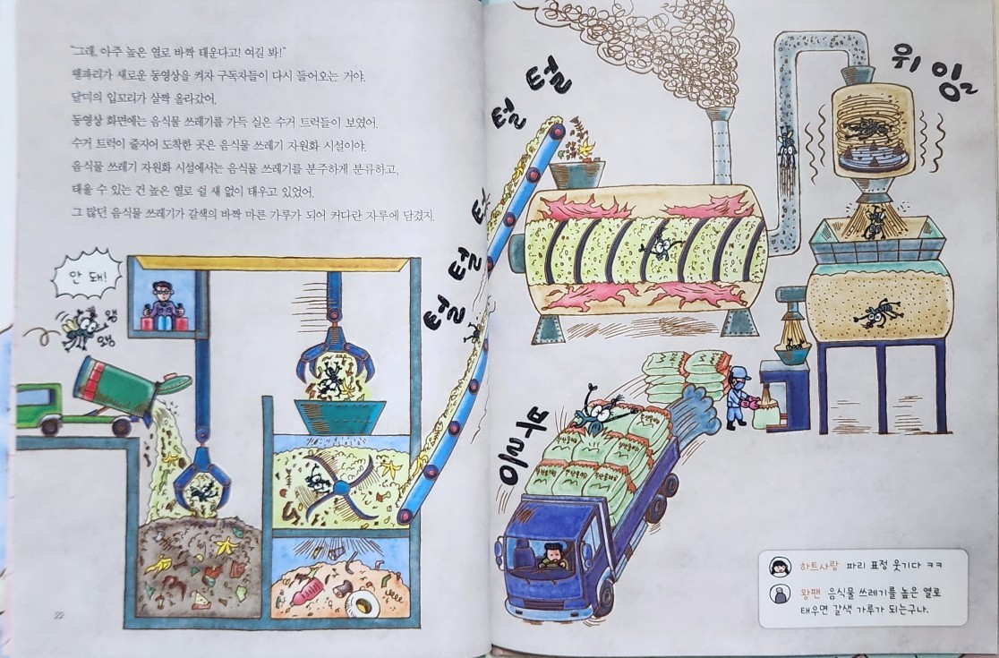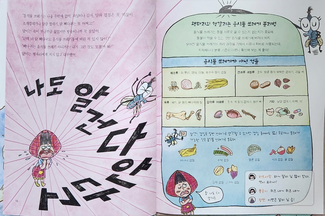 침이 꼴깍 음식물 쓰레기 파티 / 와이즈만북스<침이 꼴깍, 음식물 쓰레기 파티>는 달미와 왱파리의 음식물 쓰레기 여행을 떠나는데요.아이들의 호기심과 눈높이에 맞춘 재미있는 그림책으로 음식물 쓰레기에 대한 궁금증을 해소하고 환경 문제에 대해 생각해 볼 수 있는 책인데요.주인공 달미는 요리 유튜브 채널을 운영하는데요. 그녀의 요리 과정에 갑자기 나타난 파리 두 마리로 인해 사건이 벌어져요. 휴대폰을 통해 방송을 하던 중에 파리 두 마리가 나타나면서 달미와 함께 휴대폰 화면 속으로 빨려들어가게 되는데요.이때부터 달미와 왱파리의 음식물 쓰레기 여행이 시작되는데 그림도 너무 재미있어서 아이가 즐겁게 읽을 수 있었어요.왱파리는 달미에게 음식물 쓰레기의 발생과 처리 과정에 대해 알려주면서, 환경 문제에 대해 깊이 이해할 수 있도록 도와주는데요.특히, 음식물 쓰레기가 어디에서 나오는지부터 어떻게 처리되는지까지 자세하게 다루고 있어 좋았어요. 종종 아이들이 물어보면 엄마인 저도 설명하기 힘든 부분이 있었거든요.이 책을 통해 아이들은 음식물 쓰레기 문제에 대해 심도 있게 고민하게 되며, 실제로 환경에 대한 책임감을 느끼게 되구요.<침이 꼴깍, 음식물 쓰레기 파티>는 음식물 쓰레기 문제뿐만 아니라, 음식물 쓰레기 처리 과정에서 발생하는 환경 오염에 대해도 생생하게 다루고 있는데요. 음식물 쓰레기를 줄이는 방법에 대한 깊은 이해를 바탕으로 아이들이 실제로 음식물 쓰레기를 줄이는 데에 기여할 수 있는 방법을 생각해 볼 수 있어요. 달미와 왱파리의 이야기를 통해 음식물 쓰레기에 대한 이해를 높이고, 환경 문제에 대한 인식을 심어줄 수 있는데요. 아이들이 실제로 환경에 기여할 수 있는 방법을 생각하게 해주는 책으로 초등 저학년부터 읽어보면 매우 유익한 책으로 강력 추천드려요! *출판사로부터 도서를 제공받아 직접 읽고 후기를 작성하였습니다.#침이꼴깍음식물쓰레기파티 #와이즈만북스 #책세상 #맘수다 #책세상맘수다카페#음식물쓰레기 #음쓰 #음식점 #음식물쓰레기배출량 #동물사료 #퇴비 #음식물쓰레기자원화시설 #아프리카 돼지열병 #런던협약 #바이오가스 #음식물폐수 #음폐수 #침출수 #해양오염 #공유냉장고