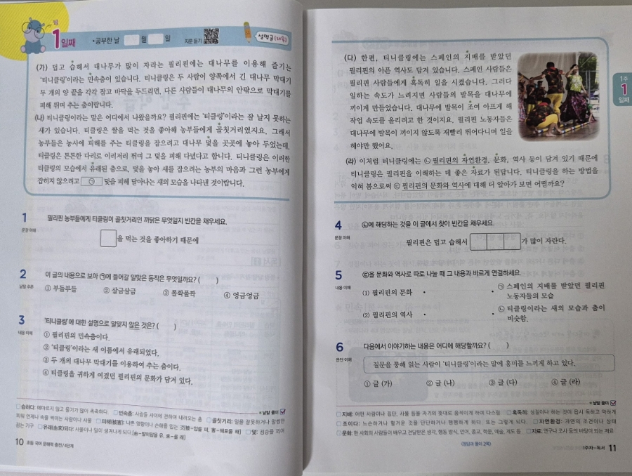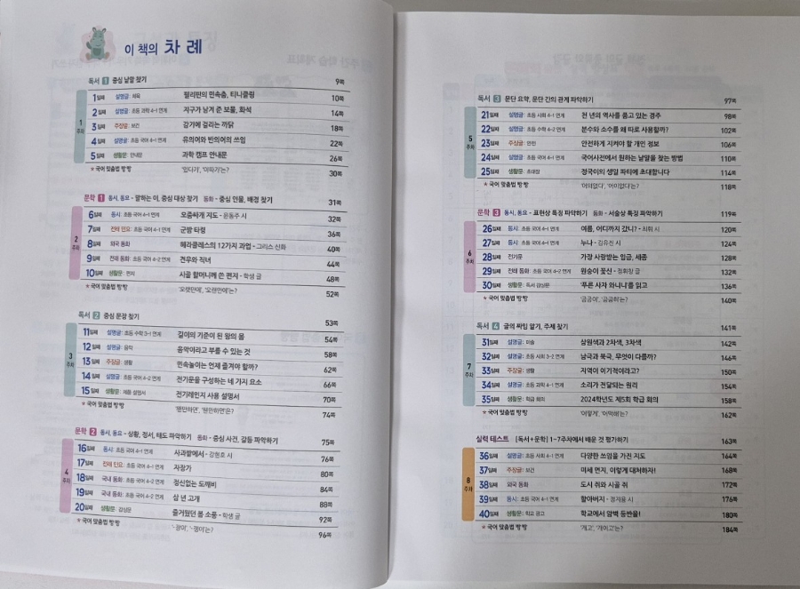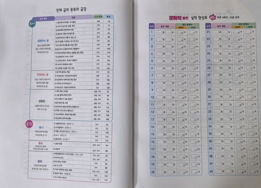 매일 한 지문씩, 총 40일 동안 학습할 수 있도록 설계되어 있어서 아이가 체계적으로 공부하는 습관을 기를 수 있을 것 같아요. 이렇게 규칙적으로 공부를 하면 독서 습관도 형성될 수 있겠다는 생각이 들어요.