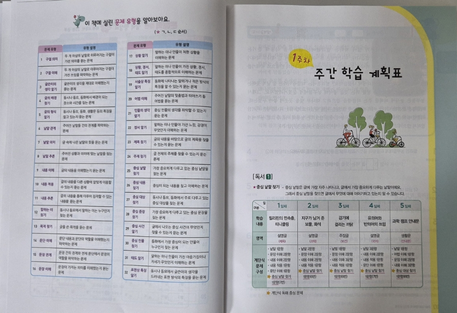 이 문제집의 가장 큰 장점 중 하나는 주간 학습 계획표가 제공된다는 점이에요. 어떤 내용으로 어떻게 공부해야 하는지 한눈에 알 수 있어서, 부모로서도 아이의 학습 진행 상황을 쉽게 파악할 수 있어요. 또 문제를 풀고나서 붙임 딱지를 붙일 수 있어 아이의 취약한 부분을 한눈에 볼 수 있겠더라구요.