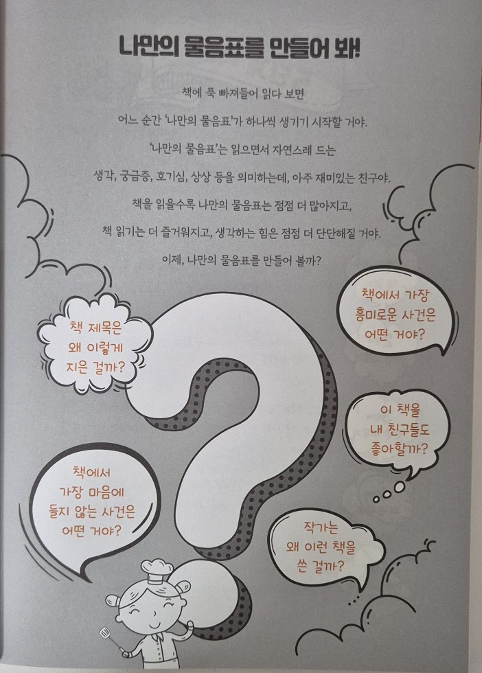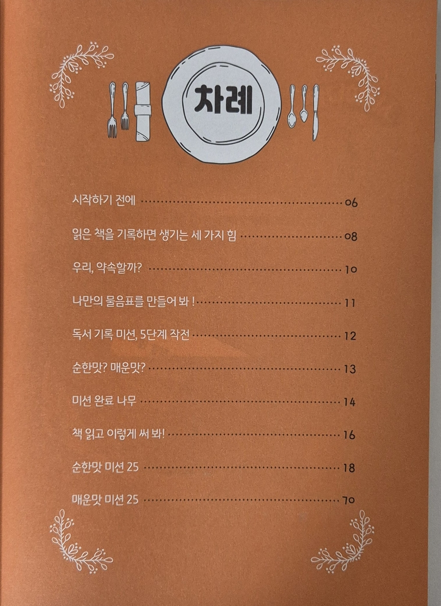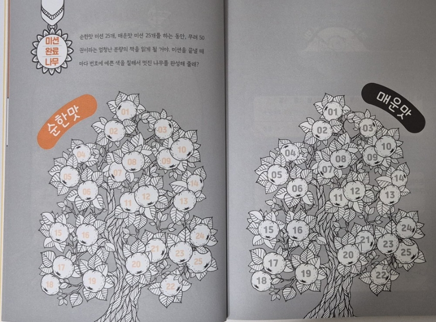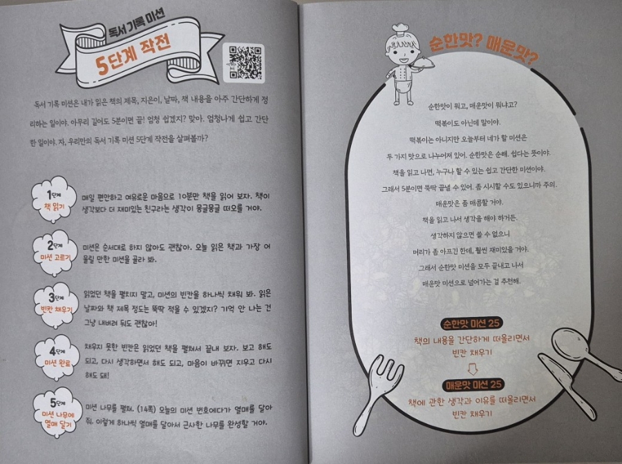 '순한맛 미션'을 끝낸 후에는 '매운맛 미션'으로 넘어가는데, 이 미션에서는 책 속에서 가장 인상 깊었던 장면을 골라보거나, 책 내용을 바탕으로 퀴즈를 만들어보는 등 더 깊이 생각할 수 있는 활동들이 나와요.