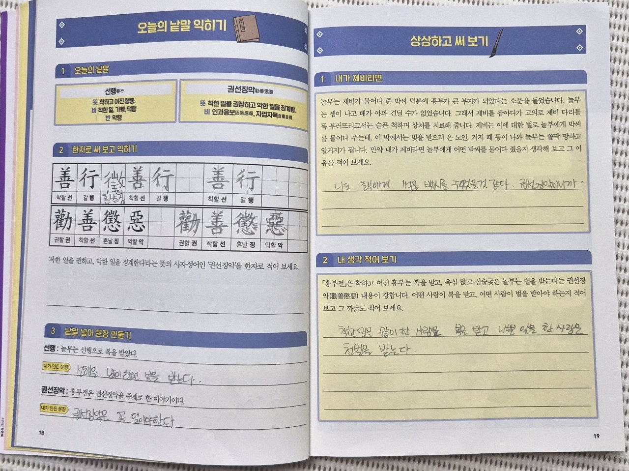한자 어휘력을 키워주는 따라 쓰기와 사고력을 향상시키는 주인공의 입장에서 생각해 보기, 자신만의 뒷이야기 쓰기 부분은 사고력 향상에 많은 도움이 될 거예요. 글쓰기가 어려운 친구들도 고전 이야기의 뒷부분을 상상해서 써보는 건 재미있게 할 수 있을 것 같아요. 교재에서 유익했던 또 다른 부분은 4장의 쉬어가기 코너인데요, 아이들이 좋아하는 초성 퀴즈와 사자성어 사행시 짓기 등은 아이들의 글쓰기 실력을 재미있게 향상시켜 줘요.