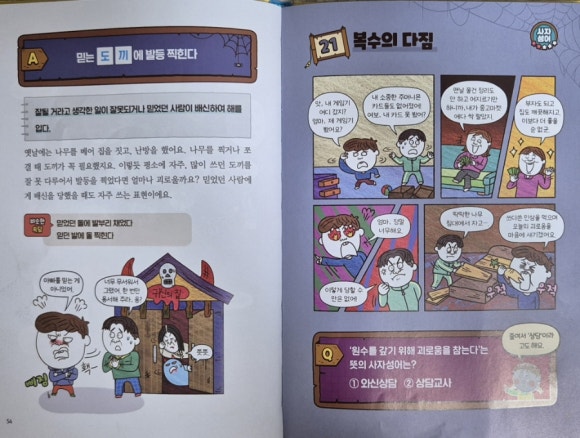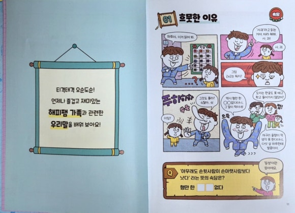 만화와 퀴즈를 통해 자연스럽게 어휘력을 확장하고 싶다면 <코믹발랄 가족 퀴즈 생활 해피팸 퀴즈북 우리말편>을 강력 추천드려요.