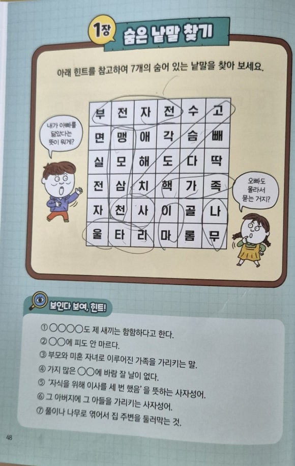 예를 들어, 만화에서 나온 힌트를 통해 퀴즈를 풀면서 자연스럽게 어휘를 익힐 수 있어요. 또, 책의 마지막 부분에는 가로세로 퍼즐과 낱말 찾기 문제도 있어서 단어의 의미를 이해하고 기억하는 데 도움을 주어서 학습 효과도 좋아요.