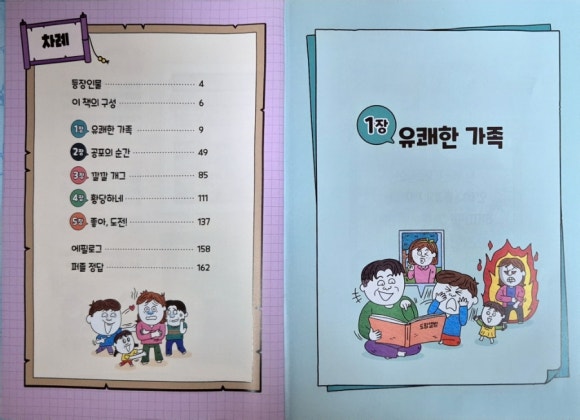 책은 총 5장으로 되어 있어요. 각 장마다 해피팸 가족의 재미있는 일상이 만화로 그려져 있어요. 만화 속에는 엉뚱대장 도야, 천재일지 모를 도빠, 잔소리꾼 도맘, 그리고 무감각 캐릭터 하루가 등장해요. 이 캐릭터들이 각각 재미있는 이야기와 함께 유용한 우리말을 소개해주는데 정말 웃기면서도 재미있어요.