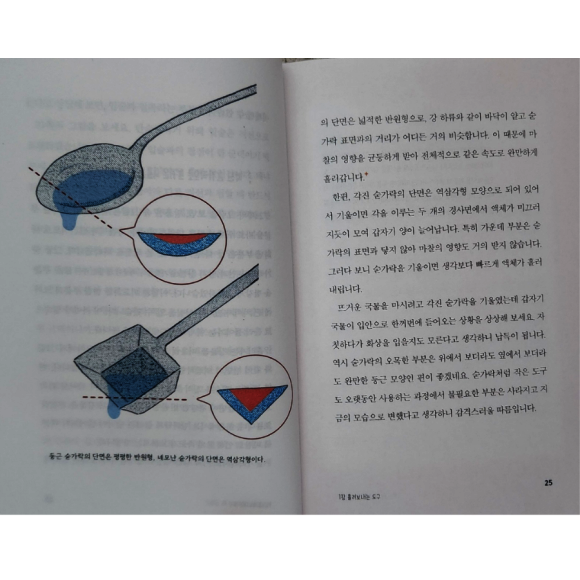 이 책에서는 숟가락의 둥근 모양이 액체를 더 잘 담을 수 있게 도와준다는 사실을 쉽게 설명해 줘요. 이렇게 평소에 아무 생각 없이 사용하던 도구들이 과학의 원리에 따라 만들어졌다는 것을 알게 되면, 물리가 어렵지 않다는 것을 알게되요.
