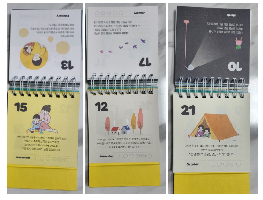 육아는 늘 즐겁기만 하면 좋겠지만, 현실은 때때로 힘들고 지치고 속상할 때도 있는데요. 이런 순간에 이 일력의 문장들은 엄마인 저에게 큰 위로와 힘이 되어줘요.