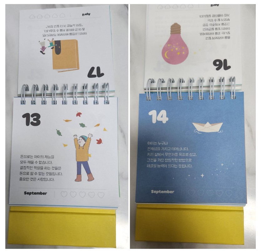 게다가 예쁜 그림과 작은 사이즈 덕분에 책상이나 식탁 위에 두고 언제든지 볼 수 있어서 정말 좋아요.​