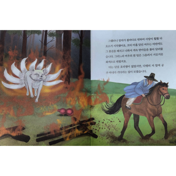 이 책은 한국의 전통 민담을 바탕으로 한 이야기로 구미호라는 신비로운 존재가 등장해요. 구미호는 꼬리가 아홉 개 달린 여우로 사람을 홀리기도 하고 간을 먹기도 하는 무서운 요괴죠. 하지만 이 이야기는 단순히 무서운 이야기만이 아니라 자연과 동물 그리고 아이들에게 중요한 교훈까지 전달해 주는데요.옛날에 어느 부자가 살았어요. 그는 아들을 셋이나 낳아서 길렀지만 딸은 없었어요. 그 부잣집에서는 예쁜 딸도 낳기를 바랬고 마나님은 딸을 간절히 바라는 마음으로 산에 올라가 백일기도를 올리기로 하였죠.그러던 어느 날, 마나님은 어여쁜 딸을 낳지만 백일기도를 드리면서 건강이 나빠진 탓인지 그만 세상을 떠나고 말아요.그 뒤로 부잣집에서는 이상한 일들이 일어나기 시작해요. 하룻밤 사이에 소와 말이 죽어 버리는 등 불행한 사건이 이어지죠. 부잣집의 맏아들은 이 모든 일이 누이동생의 짓이라고 생각하고 아버지에게 말하지만, 아버지는 오히려 화를 내며 맏아들을 쫓아내요.쫓겨난 맏아들은 여러 곳을 떠돌다가 물의 나라의 공주와 혼인을 하는데요. 어느 날, 공주 아내가 신통한 힘을 발휘해 누이동생의 정체와 그녀를 물리칠 방법을 알려줘요. 맏아들은 다시 고향으로 돌아가 누이동생과 마주하게 되죠.어여쁜 누이동생이 품은 비밀은 무엇일까요? 맏아들은 위험한 누이동생을 물리치고 공주 아내에게 돌아갈 수 있을까요?이번 그림은 기존의 그림들과는 다르게 생동감이 넘쳐서 이야기 속에 더 빠져들 수 있었는데요. 그림 속 인물들이 마치 실제로 살아 있는 것처럼 보이고 장면마다 인물의 감정을 엿볼 수 있어요.또한, 책에는 어려운 단어들이 옆에 쉽게 설명되어 있어서 아이들이 내용을 더 쉽게 이해할 수 있어요. 예를 들어, 능선(산의 표면이 이루는 선), 선돌(큰 바위를 다듬어 만든 돌기둥), 양곡(양식으로 쓰는 것식)을 뜻해요. 이런 단어들을 읽으면서 자연스럽게 배울 수 있어 어휘도 챙길 수 있어요. <여우 누이>는 단순히 무서운 이야기가 아니라 가족을 지키려는 맏아들의 용기와 자연을 존중하는 마음을 가르쳐주는 소중한 내용이였어요.우리집 아이들이 너무 좋아하는 <황석영의 어린이 민담집>‼️유아부터 초등학생이 읽어보면 너무 좋을 책으로 강력 추천드려요‼️ **출판사로부터 도서를 제공받아 직접 읽고 후기를 작성하였습니다.#협찬도서#아이휴먼#황석영#황석영의어린이민담집#황석영의어린이민담집17#어린이민담#휴먼큐브#민담#어린이민담집