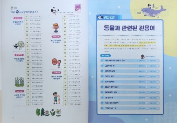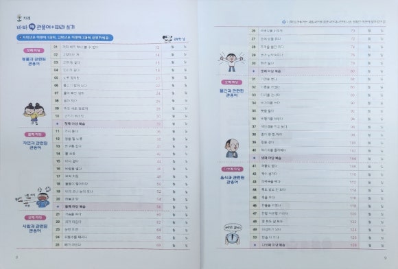이 책은 동물, 자연, 사람, 물건, 음식과 관련된 50가지 관용어를 다섯 가지 주제로 나누어 배울 수 있도록 구성되어 있는데요.