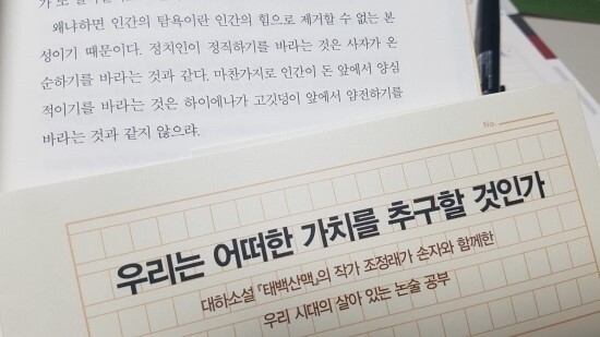 호기심과 큰 기대를 안고 읽기 시작했던 조정래 작가와 그의 고등학생 손자의 논술공부라는 주제가 흥미로웠다.