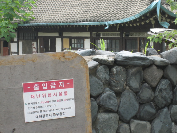 공주 갑부 김갑순의 별장으로 지어졌다는 대사동 별당. 이후 한국전쟁 20일간 대전에 마련된 임시정부 시절 부통령 이시영의 집무실로도 쓰였다고 한다. 그러나 아쉽게도 물증이 없단다. 나중에 식당으로도 쓰였다고 하는데 지금은 영락없이 흉가로만 보인다. 여기저기 깨진 유리창하며 낡은 기와와 정원이었을 법한 마당에 나 있는 무성한 풀들. 예전의 모습을 머릿속으로 복원해 보려 하나 쉽지 않다. 이곳은 대전시 중구에서 안전상 재난위험 시설로 지정되어 있다. 재난위험 시설이라니. 근대유물을 대하는 시의 태도가 극적으로 나타나는 대목같다.