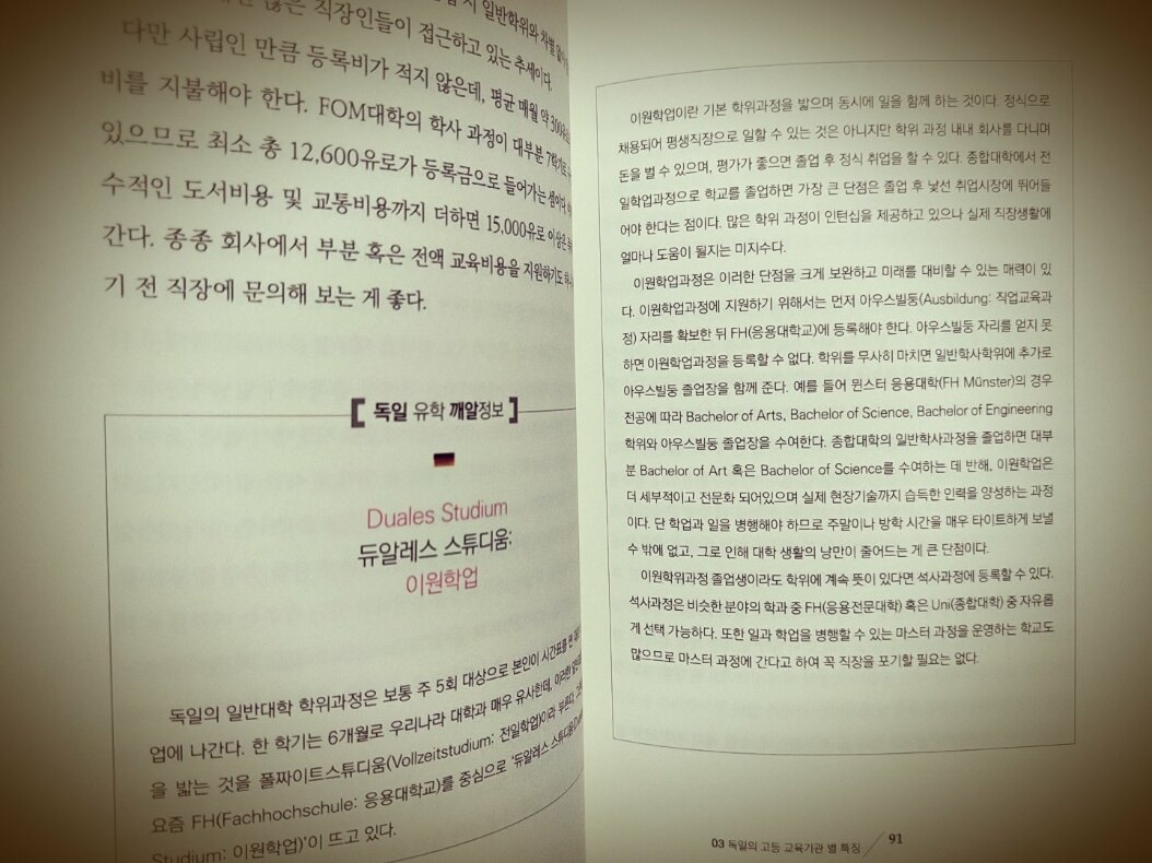 학교를 다니다가 혹은 직장을 다니다가 각자의 이유로 유학을 선택하는 일이 많아진 요즘은 유학 관련 정보들을 어렵지 않게 찾아볼 수 있다. 하지만 유학생들이 많이 유학을 떠나는 나라는 미국, 영국, 일본, 중국, 호주 등으로 독일 유학은 주로 예체능계 학생들이 주로 간다는 인식이 있어서 그런지는 몰라도 미국, 영국 유학 등에 비해선 정보 찾기가 힘들다. 이 책은 늦은 나이에 대학원 입시 및 독일 유학 전과정을 혼자 준비했던 저자의 경험을 바탕으로 쓰여진 독일 유학 안내서로 독일 유학 준비부터 실전까지 독일 유학에 대한 노하우와 팁, 유의사항을 담고있다.