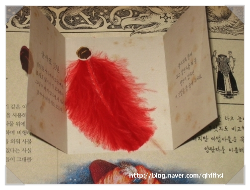 불사조 깃털...깃털을 사용하지 않을때는 표지로 덮어서 잘 보관하여야 한다. 그렇지 않으면 이 책이 날아가버릴지도 모른다.