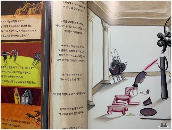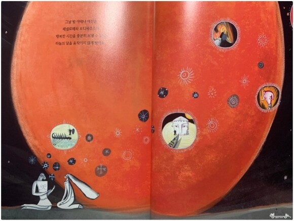 이 책은 원작 [오디세이아]의 내용을 충실히 담되 더 쉽고 짧은 글로 표현했습니다. 어째서인지 저에게는 노련한 지략가, 왠지 얄미운 사람이었던 오디세우스의 인간으로서의 한계, 때로는 자기 꾀에 넘어가 위험을 자초하는 어리석은 모습도 그려져 있어요. 그의 고된 여정을 아름답게 마무리해 주는 데 큰 역할을 하는 것은 단연 환상적인 그림입니다. 빔바 란트만의 그림으로 인해 오디세우스의 이야기가 한층 풍성해지고 매력이 가미된 느낌이에요. 그림책이고 분량도 길지 않아 읽는 데 시간이 많이 걸리지 않을 거라고 예상한 것과는 달리, 이 아름다운 그림에 빠져 찬찬히 들여다보느라 오히려 일반 소설책보다 더 많은 시간을 할애할 정도였습니다. 정말 아름다운 책이에요!