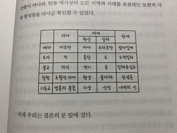 그 후 등장하는 베다, 도가, 불교, 철학에서는 용어가 조금 다르고 세부 내용에 차이가 있을 뿐 한 가지 이론에 대해 설명하고 있다. 저자가 앞서 이야기한 일원론. 이 방대한 이야기들을 표로 정리하면 다음과 같다.