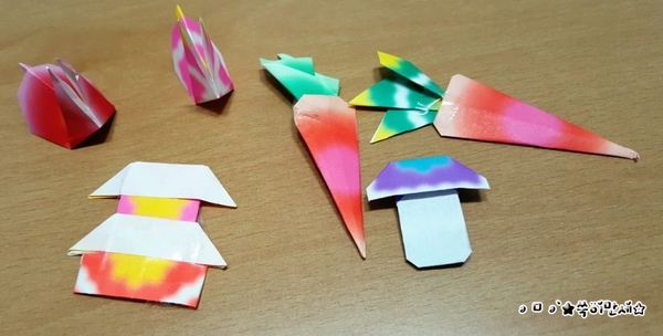 거기에 아이들이 좋아하는 동물이나 소품들이 있어서 흥미를 가지고 초반 종이접기를 할 수 있었다. 귀여운 것을 좋아하는 둘째는 토끼 먼저 도전을 첫 째는 토끼집을 만들겠다면서.. 자연스럽게 흥미로운 주제로 접기 시작. 거기에 먹이도 필요하다면서 당근을.. 뚝딱!